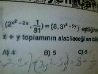 hulahoppadanayar Mesaj tarihi: Ekim 29, 2005 Mesaj tarihi: Ekim 29, 2005 (2x²-2x,1/81)=(8,3y²-5y) ise x+y en büyük kaçtır? A)4 B)5 C)6 D)7 E)9 arkadaşlar kaç kişiye sordum kimse bulamadı yardım lütfen bide açıklarsanız daha güzel olur =)[signature][hline]Turuncu Pati... Ne o öyle beyaz, mor, eflatun, çingene pembesi pati fln ya. Msn:[/b][email protected] Gmail:[/b][email protected]