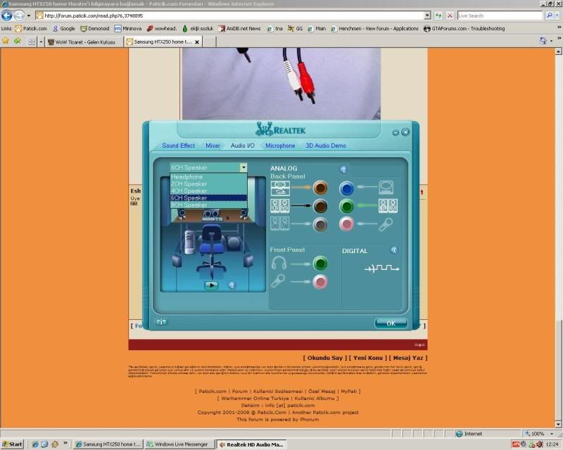 Korax Mesaj tarihi: Aralık 13, 2008 Mesaj tarihi: Aralık 13, 2008 ha soyle :) simdi aciklayayim, 2. kombinasyonda gösterdigim kablodan 3 adet alacaksin.Yani sundan; http://img116.imageshack.us/img116/1205/12122008909vo8.jpg Sonra bu kablolarin lale olan uclarini(yani kulaklik girisi olmayan cift uclarini) home theater'in front/rear ve subwoofer kisimlarina gireceksin.Front uclarini hometheater'a taktiktan sonra,kulaklik girisi olan ucunu bilgisayarin yesil girisine,rear uclarini taktiktan sonra kulaklik ucunu gri girise(yada siyah girise) sub/center uclarini taktiktan sonrada bilgisayarin turuncu olanina giriceksin.Hepsi bukadar :) Hadi kolay gelsin