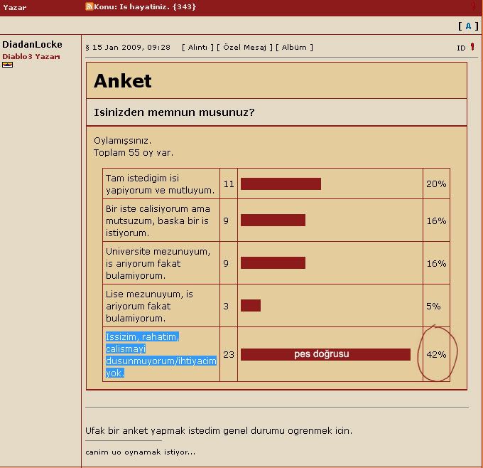 Luriel Mesaj tarihi: Ocak 16, 2009 Mesaj tarihi: Ocak 16, 2009 bence ordaki çogu kişi benim gibi çalışmıyorum üniversitedeyim anlamında onu işaretlediginden o kadar yüksek :P