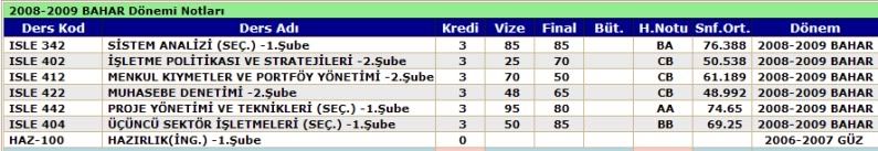 sipeyskeyk Mesaj tarihi: Haziran 19, 2009 Mesaj tarihi: Haziran 19, 2009 BA 450 Effective Leadership Practices Gülem ATABAY 64 (DD) BA 470 International Financial Reporting Standarts Serdar ÖZKAN 68 (DC) ECON 204 Applied Microeconomic Analysis İsmail BULMUŞ -(FF) ECON 306 International Economics II Turan SUBAŞAT 50 (DC) ECON 318 Topics in Macroeconomics Mehmet İVRENDİ 62 (DD) GER 302 German Language VI 3 Hülya ESER 70 (CC)