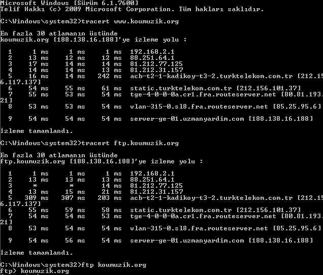 di Mesaj tarihi: Haziran 25, 2010 Mesaj tarihi: Haziran 25, 2010 Baslat > calistir > cmd [enter] tracert hebele.com Takildigi yer var mi yok mu bi bak. ftp hede.com Baglanip baglanmadigina bak bi yine.