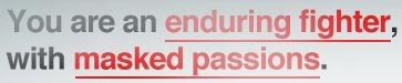 Soris Mesaj tarihi: Ekim 18, 2012 Mesaj tarihi: Ekim 18, 2012 https://s3.amazonaws.com/HuntedWebContent/test1/final/title4.png Unlike most people, you have a strong — at times destructive — independent streak. Routine tasks are frustrating and often impossible to complete, unless you’ve created them for yourself. At the moment, you are under substantial stress and anxiety. This is caused by the unshakable feeling that you’re not fully in control of your own life. An existing relationship in your life, either romantic or business-related, is currently unsatisfactory. You’re presently contemplating the possibility of escape. This can make you irritable or uncomfortable at times, even around the people you love. However, when you are in control, you’re capable and even excited to make difficult decisions. This occasionally leaves you feeling isolated or alone. You are willing to make this trade-off, if it means being in charge of your own life. The darker emotions inside you — those underlying urges that all humans have — are very strong. And yet, you have the ability to harness that energy to achieve your goals. This makes you unique among our testing population. You can focus your energy, both positive and negative.