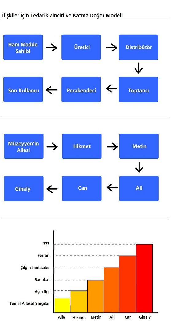 SeaGle Mesaj tarihi: Nisan 2, 2013 Mesaj tarihi: Nisan 2, 2013 Efrasiyab said: Bir de bu kızla bir ilişki yaşama ihtimaliniz varsa bile, baştan çiçek alarak şımartırsan, beklentisi o şekilde ve hatta artarak devam eder. Yani anlayacağın çitayı yükseltmişsin kardeş :D Daha fazlasını isteyecek git gide, iyi bir jest fakat boka sarabilitesi yüksek onu diyom. bkz: ginaly reyizin iliskiler ve beklentiler uzerine incelemesi. ginaly said: Her ayrılık demek kızın yeni bir adam bulması demek. Her yeni adam da farklı bir özelliği ile kızın dikkatini çekecektir. Zaten önceki adam ile aynı olsa kız niye ayrıldığı tipteki adamlar bir daha çıksın değil mi ya? Bu her yeni özellik kızın ufkunu genişletecek, "aa erkeklerde bu özellik de olmalı ya bak ne güzel" dedirtecektir. Yani kızın beklentilerine bir katma değer eklenmiş olacaktır. Tedarik zinciri denilen şey bir malın sıfırdan biz kullanıcılara ulaşana kadar olan sürecini tanımlar. Temel olarak ilk şekildeki gibi bir şeydir. Bunu karı kıza uygularsak, Müzeyyen bir pozitif tam sayı olmak üzere, Ailesi hammadde sağlayıcı ve sırayla çıktığı her erkek, yeni bir değer katan bir erkek. Bu zincirin halkalarının her biri Müzeyyen'in beklentilerine bir değer katar ve Müzeyyen'in beklentileri gitgide artar. Bakınız ben Müzeyyen'le çıkmaya kalksam neler neler sağlamam gerekir. Halbuki sizler kız arkadaşlarınızdan bu kadar ayrılmasanız, hatta görücü usulü dediğimiz fabrika satış mağazası sistemine geri dönsek, Kızların beklentileri ne kadar da aşağıda olacak ve biz ne kadar rahatça mutlu edecez onları. Yapmayın, etmeyin.